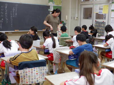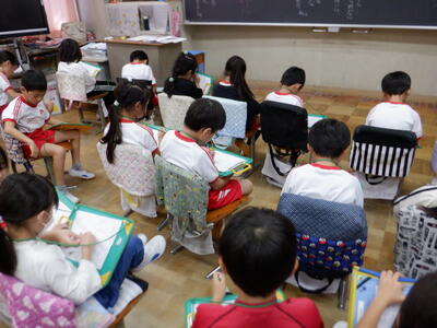 | 2年生の書写では、「よこ画」「たて画」「右はらい」「まがり」など、基本的な筆使いを丁寧に学習しました。今回は「雨音」や「公園」といった言葉を題材に、文字の形やバランスを意識しながら、集中して取り組む姿が見られました。 書写の時間になると、教室は一気に静まり返り、子どもたちは筆先に気持ちを込めて文字を書いています。一画一画に心を込めて書くことで、文字の美しさだけでなく、集中力や丁寧さも育まれていきます。 これからも、書写を通して「書くことの楽しさ」や「美しい文字への関心」を深めていってほしいですね。 |