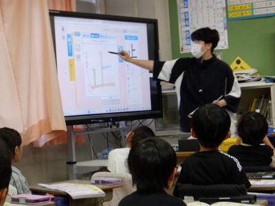 | 2年生の算数では、「角」についての学習が始まりました。授業では、最初に角のないフニャフニャにかたどられた折り紙を使い、2回折って角を作る活動を行いました。子どもたちは、折り紙を教科書やノートに当ててみたり、三角定規と比べてみたりしながら、どんな形に角があるのかを調べました。 その結果、教科書やノートには4つの角があること、三角定規には1つ角があることがわかり、これらの角の名前が「直角」であることを学びました。これまで「四角いところがある」と言っていた子どもたちも、「直角がある」と言えるようになり、言葉の使い方にも成長が見られました。 身の回りのものに目を向けながら、楽しく学びを深める2年生の姿が印象的でした。 |