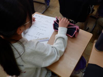 4年生の算数では、分数の学習を進めました。問題は、 学習の中では、分母よりも分子が大きい「仮分数」についても取り上げました。子どもたちは、図を見ながら分数で表す方法を考え、分母と分子の関係を理解しようと一生懸命取り組んでいました。 分数の表し方を工夫しながら考える姿から、算数の面白さを感じ取っている様子が伝わってきました。 |