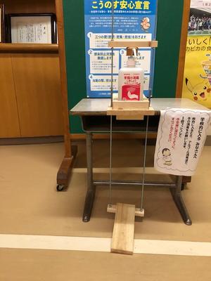 ちょと工夫したところは、設置する机の高さや幅に対応できること、バネでペダルがしっかりと戻ることです。ポンプの上の部分に、椅子の脚用のゴムキャップに切り込みをつけてはめているので、アルコールのボトル交換も簡単にできます笑う