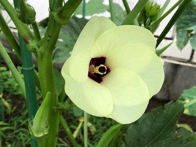 もわっとする曇り空の下、まるで街灯のように明るく光るオクラの花が目を引きます。オクラは食べてもおいしいですが、鑑賞の花としても十分な魅力がありますね。