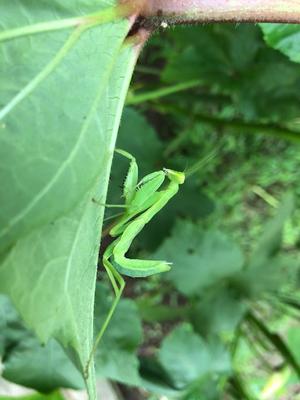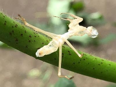 その1 オクラの葉の上に、脱皮したてのカマキリが、おしりをキュッと跳ね上げた可愛い姿でジッとしていました。近くには脱皮した殻が残っていました。カマキリのいい写真を撮ろうと思って手を出すと、カマキリは自分の手の上にぴょんと乗り、なんと、半そでのワイシャツの袖からシャツの中に入ってしまいました。背中の方でモゾモゾ動くカマキリをつぶさないように、物陰でシャツを脱いで無事救出。カマキリをオクラの葉にもどしました。