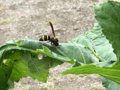追記:後で調べてみたら「オオフタオビドロバチ」というドロバチでした。腹に黄色の二つの帯があるので、「オオフタオビ」という名前がついているとのこと。メイガなどの幼虫を探し出し、麻酔の毒針を刺して巣に運びます。そして、卵を産み付けた部屋に捕まえた幼虫を閉じ込め、卵がかえった時のための餌とするそうです。性質は大人しく、人をむやみに攻撃してきたりすることはないそうです。大きさと見た目が少し「アシナガバチ」に似ているので、これまでに「ハチだー!」と不必要に逃げていた人は多いかも知れませんね。