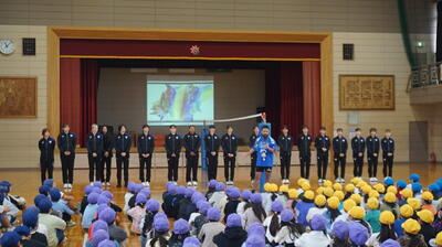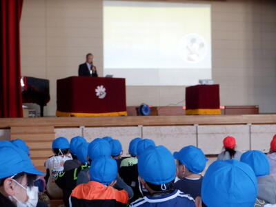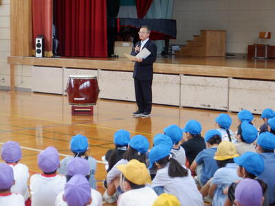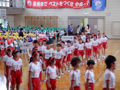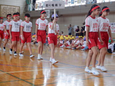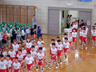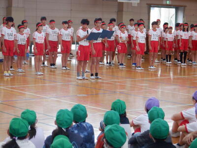 本日の全校朝会では、明日開催される陸上競技大会に出場する6年生の選手たちへ、1年生から5年生の児童たちが力強いエールを送りました。体育館いっぱいに響き渡る「がんばれ!」の声と大きな拍手は、まさに圧巻。その応援は、きっと選手たちの心にしっかりと届いたことでしょう。 |