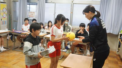 子どもたちのバレー交流が終わったのち、直徳の岩上様が、自らの体を使ってプロの力のすごさを結の子たちに見せてくれました。そして結の子の一人一人に、上尾メディックスの選手たちが載っているクリヤファイル等とクラスにソフトバレーボールの目録をプレゼントしてくれました。実際のプレゼントは、各教室で選手からクラスの代表者に渡されました。