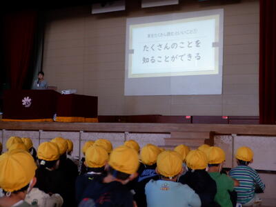 | 11月は読書月間です。今朝の全校朝会では、校長先生が図書室にある本の紹介をしてくださいました。今回取り上げられたのは『あるかしら書店』という絵本。ユニークな本屋さんを舞台に、本の世界の楽しさや奥深さを教えてくれる一冊です。 校長先生の読み聞かせに、子どもたちは真剣な表情で耳を傾け、スクリーンに映し出された絵に目を輝かせていました。本の魅力に触れる貴重な時間となりました。 読書月間をきっかけに、図書室の本をたくさん借りて、いろいろな物語や知識に出会っていきましょう。本との素敵な出会いが、きっと皆さんの心を豊かにしてくれるはずです✨ |