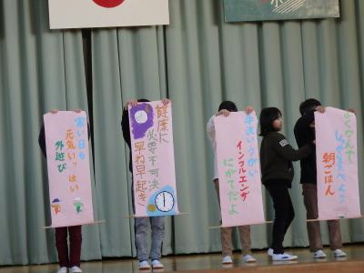 今月の生活目標について、保健委員会の児童がクイズやアンケート結果をもとに「健康な心と体を保つためのポイント」を、分かりやすく全校児童に伝えていました。児童一人一人が、自分の体と心を見つめ、大切にしてほしいと思います