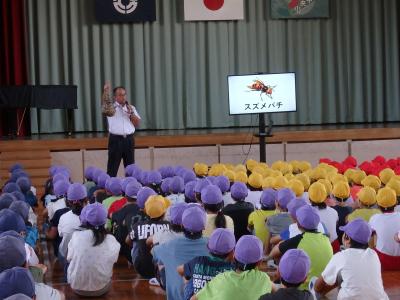 先週末、学校の敷地内に「コガタスズメバチの巣」があることが分かり、専門業者に早急に撤去していただきました。そのハチの巣(安全な状態に加工しました)を全校児童に紹介しながら、今日の校長講話は「ハチ」についてのお話でした。 ハチの習性や、「女王バチ」「はたらきバチ」「オスバチ」にはそれぞれ役割があることなどについて、児童は、興味深く校長先生のお話を聞いていました。 校長室前に、「コガタスズメバチの巣」を展示しています。 |