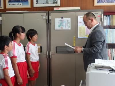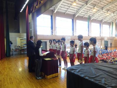 今日は、「6年生の参加した陸上競技大会」、「読書感想文コンテスト」、「発明創意工夫展覧会」で優秀な成績を収めた皆さんが表彰されました