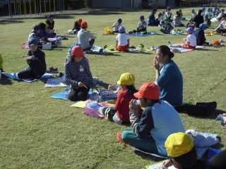 2学期は、学校評議員の皆様と一緒にに、家から持ってきた、おにぎりと給食のおかずを弁当箱に入れて、芝生の上で楽しく食べました。