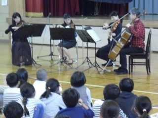 「クレアの森 カルテット」4名の皆様によるコンサートが行われました。クラシックや映画の主題歌、中央小の校歌を演奏していただきました。また、児童代表3名による演奏体験をさせていただきました。