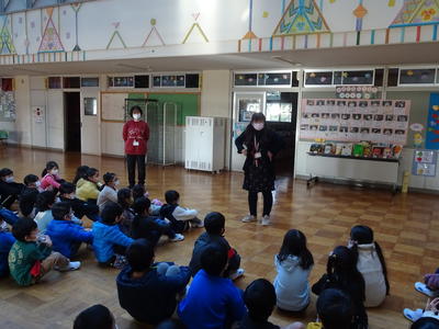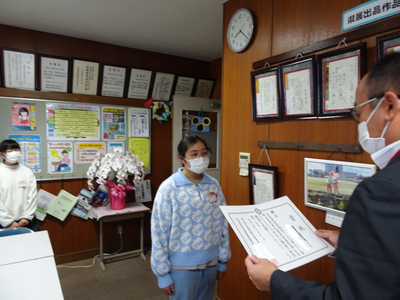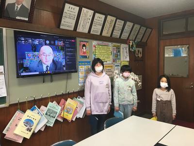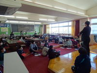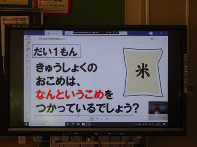 大戸先生の全校での名札の確認、生徒指導のお話の後、今月の生活目標の発表がありました。1月の生活目標は「好ききらいをしないで食べよう」です。給食委員会が作成した動画を楽しく見ることができました。今日から給食が始まりました。きっと好ききらいをせず、久しぶりの給食を楽しんだことでしょう。