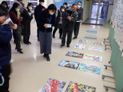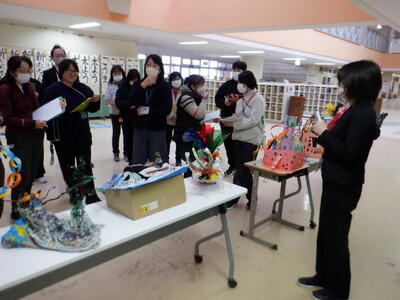 | 本日、放課後に全教職員を対象とした教育力向上研修を行いました。今回は「図工」をテーマとし、長年、図工教育を研究してきた先生を講師としてお招きしました。先生には、実際の児童作品を手に取りながら、指導のポイント等ついて丁寧にご指導いただきました。 研修では、1年生から6年生までの立体作品・平面作品を順に見ながら、良い点や指導の工夫、さらに次の学習につながるアドバイスなど、多くの学びを得ることができました。 また、カッターやハサミなどの刃物を扱う授業では、安全性を高める工夫、版画の色づけでは原色を使うとはっきりとした印象になる一方、グラデーションを加えることで奥行きが生まれることなど、実践的な指導法も教えていただきました。 今回の研修で得た学びを、今後の授業づくりに生かし、子どもたちがより創造的に表現できる図工の授業を目指してまいります。 |