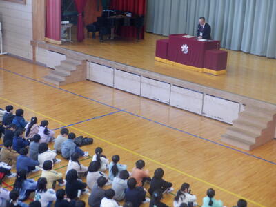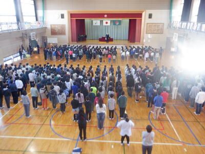 終業式のあと、生徒指導主任の先生から冬休みの過ごし方についてお話がありました。子どもたちが安全に、そして充実した冬休みを過ごせるようにと、「4つのK」をキーワードにした温かいメッセージが届けられました。 1つ目の「K」は 「きそく」。 2つ目の「K」は 「計画的に」。 3つ目の「K」は 「お金」。 4つ目の「K」は 「危険」。 交通安全のお話では、車が時速40kmで走っている場合、ブレーキを踏んでから止まるまでに 21m も進んでしまうことを紹介しました。実際に21mの長さをすずらんテープで確かめると、子どもたちは「こんなにも止まらないんだ」と驚いた様子でした。こうした体験を通して、子どもたちは自分の身を守る大切さを実感していました。 冬休みが、子どもたちにとって安全で、家族と温かい時間を過ごせる期間になりますように。 |