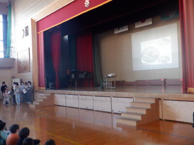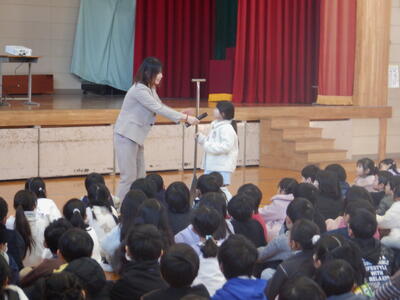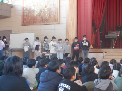 今日は、給食委員会の6年生が、今月の生活目標について全校児童に向けて発表を行いました。冬休み明けの初日という忙しいタイミングにもかかわらず、子どもたちは一人ひとりが自分の役割をしっかりと果たし、堂々とした姿を見せてくれました。その姿には、最上級生としての頼もしさがあふれていました。 |