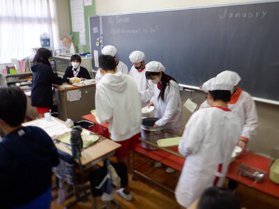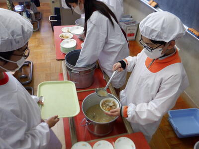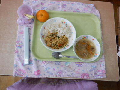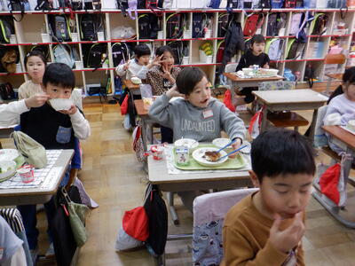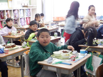| 今日の給食は「麦ご飯、キムたま丼の具、大根としめじの中華スープ、みかん、牛乳」でした。中でもキムたま丼は5・6年生に大人気。配膳が終わるとすぐに、「おかわりあるかな」とそわそわしながら立ち上がる姿があちこちで見られました。お皿を手に、嬉しそうに列に並ぶ子どもたちの表情は、とてもほほえましいものです。 美味しい給食は、あっという間に完食。しっかり食べて、たっぷり栄養をとった子どもたちは、午後の学習にも元気いっぱいで向かっていけそうです。食べることを楽しむ姿から、日々の成長と健やかさが伝わってきて、見ているこちらまで心が温かくなりました。 |