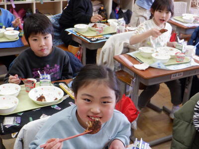 | 今日の給食には、6年生が家庭科の授業で考えた献立が実際に採用されました。 「甘い主食と体によい副菜を組み合わせて、栄養バランスのよい食事にしたい」という、子どもたちのやさしい願いが込められています。 主食の「ココア揚げパン」には、糖質や脂質のほか、食物繊維・鉄分・マグネシウムなど、成長期にうれしい栄養がしっかり含まれています。 “おいしいだけでなく、みんなの体のことも考えたい”という6年生の思いが伝わってきます。 デザートの「カップdeヤクルト」には乳酸菌が含まれ、お腹の調子を整えてくれる働きがあります。 子どもたちが考えた献立には、仲間の健康を思う気持ちがそっと込められていました。 給食の時間には、ココアの粉を口のまわりにつけながら、嬉しそうにほおばる子どもたちの姿が見られました。 「おいしい!」という声があちこちから聞こえ、教室中が笑顔で満たされました。 ココア揚げパンは、今日も子どもたちに大人気でした。 |