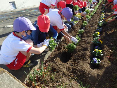8:20~の短い時間でしたが、各担当場所にパンジーなどの色とりどりの花を植えました