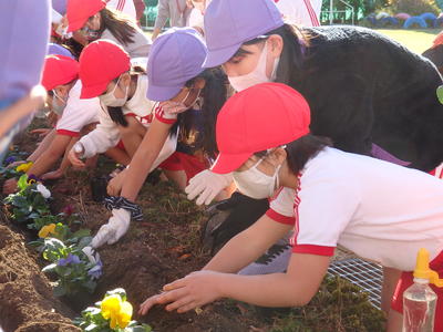 昨日の「花植え集会」で植えたパンジーへ、子どもたちが水やりをしてくれています。