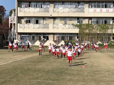 これまでは、クラス全員での集団走で走りはじめ、途中から各自のペースでのランニングという形で行っていましたが、「熱中タイム」時間短縮のため、始めから自分のペースでどんどん走る方法で行っています。
