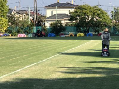 今日は、芝生メンテナンスの今期最終日でした。「生出塚菜園ボランティア」の方々には、週2回というこまめで丁寧な芝生の管理をしていただきました。特に、今年度は芝生の長さと密度が例年以上に素晴らしく、子供たちはとてもよいコンディションの校庭で活動させていただきました。本当にありがとうございました