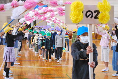 「一年生を迎える会」を行いました。体育館で行いましたが、体育館には1年生と2年生と6年生のみで、後の学年は教室での映像中継