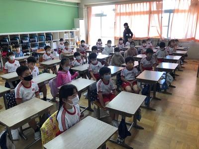 全校朝会では「声のみの放送」の良さも感じていましたが、今回は、動画や写真を使いたかったので、事前録画の映像配信としました。また、話を聞いている子供たちの様子を、横から見ることができるので、それもちょっとした良さに感じました。2年生たち、とてもいい姿勢で集中して視聴していました!