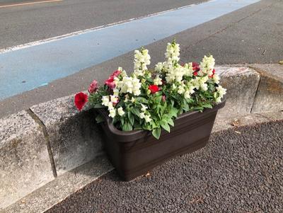 鴻巣駅から免許センターまでの通り沿いに、色とりどりの花が咲いているプランターが設置されました。これは鴻巣市が設置した花々で、学校の西側フェンスにも掛けるタイプのプランターで花を飾っていただいています。