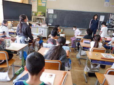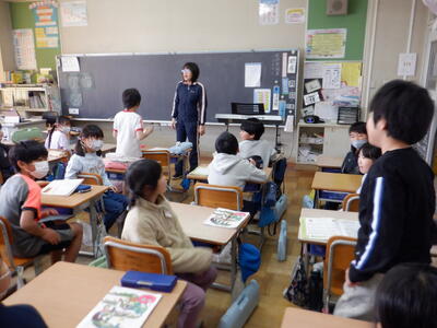 | 3年生の国語では「すがたをかえる大豆」の学習を行いました。 本日は栄養教諭の先生をゲストティーチャーにお迎えし、大豆がどのように姿を変えて私たちの食卓に並ぶのかを教えていただきました。 先生には、実際に昨日買ってきてくださった大豆の加工食品を紹介していただきました。油揚げや厚揚げ、豆腐、味噌など、子どもたちにとって身近な食材がずらりと並びます。子どもたちは「食べたいな~」「その味噌は給食でも使っているの?」など、興味津々でたくさんの声をあげていました。 国語の教科書で学んだ内容が、実際の食材と結びついたことで、子どもたちにとってより深い学びとなったようです。いつもとは少し違う、楽しくておいしそうな国語の授業になりました。 |
