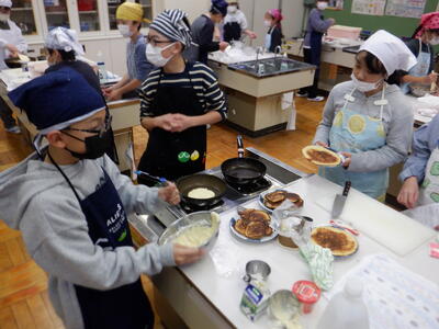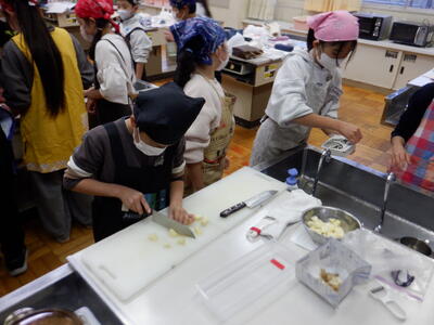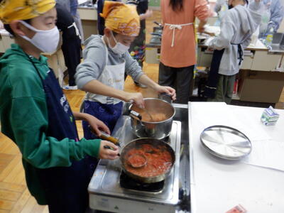| 5年生の家庭科では「白米と味噌汁」の学習をしました。 白米の炊き方は2回目ということもあり、子どもたちは慣れた様子で手際よく進めていました。 味噌汁に入れる具材はグループごとに工夫があり、「タマネギ・わかめ・豆腐」を選んだグループや、「さつまいも」を入れたグループなど、バリエーション豊かでした。 みんな楽しそうに調理をしていて、出来上がった料理をニコニコしながら食べる姿が目に浮かびます。 子どもたちの工夫や協力が光る、温かい時間となりました。 |