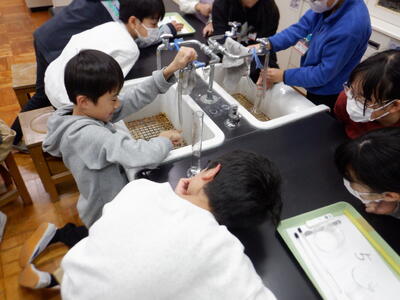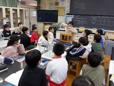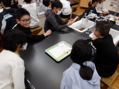| 5年生の理科では、「もののとけ方」の学習を行いました。まずは、片栗粉を溶かした水とコーヒーシュガーを溶かした水を比べながら、「水溶液とは何だろう」という問いに向き合いました。透明になったコーヒーシュガーの水を見て、「これが水溶液なんだ」と気付いた瞬間の子どもたちの表情は、とても誇らしげでした。 | ||