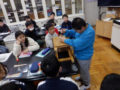 | 5年生の英語では、「We have a(an) 〜.」という表現の学習を進めました。 声に出して発音し、耳で聞き取り、意味を確かめながら覚えていく中で、子どもたちの表情には少しずつ「わかってきた」という自信が芽生えているようでした。 授業の最後には、「Places Destiny Game」という英語のすごろくに挑戦。 2人組や3人組で協力しながら、英語の表現を使って進めていくゲームに、教室には楽しそうな笑い声が広がりました。 「言えたよ」「通じたよ」と嬉しそうに伝え合う姿は、とても微笑ましく、英語を使うことへの前向きな気持ちがしっかり育っていることを感じます。 英語で伝える楽しさを味わいながら、少しずつ表現の幅を広げていく5年生。 その姿はとても頼もしく、これからの成長がますます楽しみです。 |