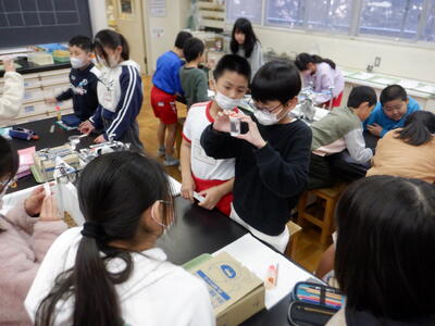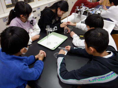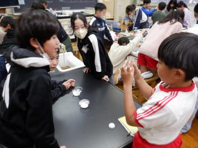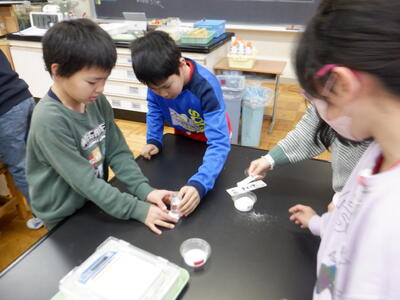 | 続いて、食塩やミョウバンを水に溶かす前と後で重さが変わるのかを調べる実験にも挑戦しました。多くの班が「重さは変わらない」という結果を得ましたが、途中で少しこぼしてしまい、重さが減ってしまった班もありました。それでも、「どうしてこうなったんだろう」と友だちと話し合う姿は、学びに向かうまっすぐな気持ちそのもので、見ていてとても温かい気持ちになります。 どの班も、協力しながら楽しそうに実験を進めており、教室には前向きなエネルギーがあふれていました。自分の手で確かめ、考え、友だちと共有する経験は、子どもたちの心にしっかりと残っていくはずです。 こうした日々の積み重ねが、子どもたちの「わかった」「もっと知りたい」という気持ちを育てていくのだと思います。 |