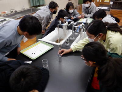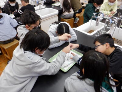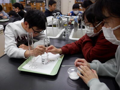 5年生の理科では、「もののとけ方」の学習を進めています。 まずは、正しい量を測るためにメスシリンダーのメモリの読み方から学習をスタート。 実験が始まると、50mlの水に食塩を1杯、2杯、3杯…と入れていき、 自分の手で確かめることで、教科書だけでは味わえない“発見の喜び”が子どもたちの表情に広がっていきます。 |