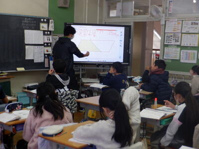 | 5年生の算数では「台形の面積の求め方」について学習しました。 子どもたちはそれぞれの考えをデジタル黒板に書き出し、みんなで共有しながら解き方を探りました。 簡単な考え方として、同じ形の台形を上下反対にしてくっつけると平行四辺形になることに気づきました。そこから、平行四辺形の面積の求め方を使い、最後に「÷2」をすれば台形の面積が求められることを学びました。 「この考え方が合ってたんだ!!やったー!!」と喜ぶ子どもの姿もあり、自分の考えが正しかったことを確かめる喜びを感じていました。 学習を通して、図形の性質を活かした考え方や、友だちと考えを共有することで理解が深まる楽しさを味わうことができました。 |