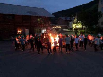 キャンプファイヤーしています!元気な掛け声が志賀高原の夜に響いています。子供たち、楽しんでます!