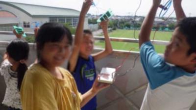 理科の実験の様子です。光電池を使って電気をつくり、プロペラモーターを回しました。