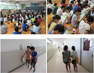 6月26日、アイマスク・ガイドヘルプ体験を行いました。まず、視覚障がいの方から、普段の生活で気を付けていることや工夫していることなど、具体的に話を聞きました。