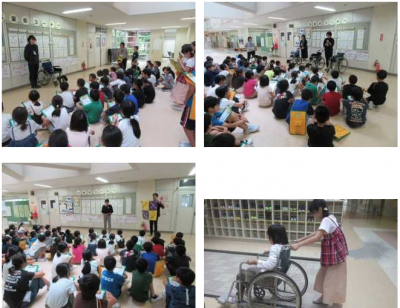 ほとんどの児童が、車いすには初めて触りました。車いすの扱い方を教えていただいた後、2人1組になって、車いすに乗ったり、押したりする体験を行いました。