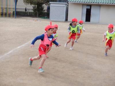 | 先生の合図とともに走り出すと、鬼役の子は一生懸命に追いかけ、逃げる子は笑い声をあげながら全力で駆けていきます。どちらの役の子も、夢中になって体を動かしながら、友だちと一緒に遊ぶ楽しさを味わっていました。 走り終えた後の「楽しかった!」という笑顔は、見ているこちらまでうれしくなるほど。子どもたちが安心してのびのびと過ごし、仲間と関わりながら成長している姿が感じられる時間となりました。 |
