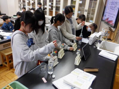 | 6年生の理科では、「水溶液」の学習に取り組みました。今回は「塩酸」「炭酸水」「食塩水」「石灰水」「アンモニア水」の5つについて、見た目やにおい、二酸化炭素を含ませたときの変化を実験で確かめました。 試験管をのぞき込む子どもたちの表情は、とても真剣です。それでも、変化が見られた瞬間には、思わず顔を見合わせて笑ったり、「できた!」と小さな声を弾ませたり、教室には温かな空気が広がっていました。どの班も協力しながら結果をまとめ、しっかりと結論までたどり着くことができました。 自分の手で確かめ、友だちと考えを共有しながら学ぶ時間は、子どもたちにとって大切な経験です。実験に夢中になっている姿を見ていると、「学ぶって楽しい」という気持ちが、確かに育っていることを感じ、心がじんわり温かくなります。 これからも、こうした学びの積み重ねを大切にしながら、子どもたちの成長を見守っていきます。 |