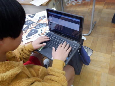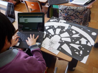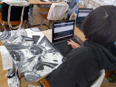 | 6年生の図工では「モノクローム」という授業を行いました。 本来は「白黒」で表現する平面画ですが、今年度は白黒を主体としつつ、色も取り入れて作品を完成させました。 今日は、完成した自分の作品について「工夫した点」をノートPCで担任の先生に送る活動をしました。 「自分の作品の工夫点はどこだろう」と悩みながら見つけ出す子もいれば、すぐに工夫点を見つけて打ち込んでいく子もいて、それぞれの姿が見られました。 作品づくりだけでなく、自分の考えを言葉にして伝えることを通して、表現の幅を広げる学習となりました。 |