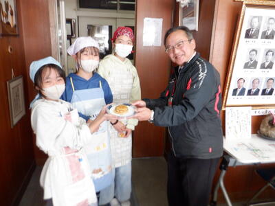 | 6年生の家庭科では「小麦料理」に挑戦しました。 「ホットケーキ」を作る班や「パン」を作る班があり、それぞれ工夫しながら調理を進めました。 出来上がった料理を先生方に届ける子どもたちの顔はニコニコ笑顔。作っているときの楽しさがその表情から伝わってきました。校長先生にはホットケーキを持って行き、とても嬉しそうに受け取っていただきました。 子どもたちの笑顔と達成感にあふれる家庭科の時間となりました。 |