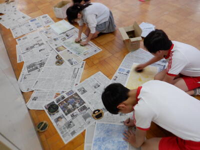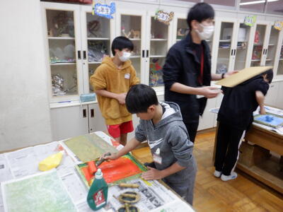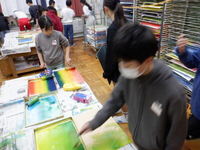 | 6年生の図工では、2組と3組が合同で「スチレンはんが」の学習を行いました。 子どもたちはそれぞれの板に、思い思いの色を重ねて模様を描き、丁寧に塗り上げていきました。製版の際には、紙を慎重に置き、バレンで力を込めて写し取る姿が見られました。 2クラスが一緒に図工室に集まると、いつも以上に活気にあふれ、賑やかな雰囲気の中で取り組むことができました。友達同士で作品を見せ合い、「すごいね」「きれいにできたね」と声を掛け合う姿は、互いに刺激を受けながら学び合う子どもたちの成長を感じさせてくれます。 一人ひとりの工夫が作品に表れ、仲間とともに創り出す楽しさを味わうことができた今回の授業。完成した作品には、子どもたちの挑戦と喜びがしっかりと刻まれていました。 |