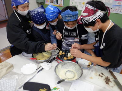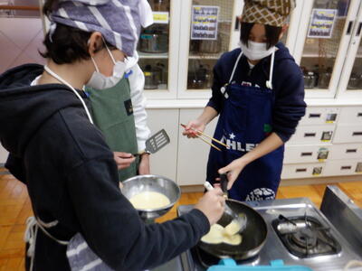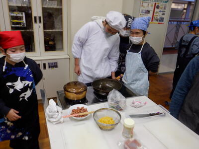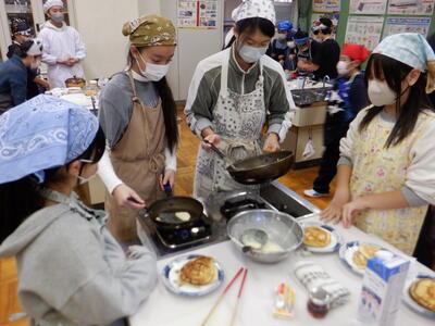 | 中でも焼きうどんを作った班では、出来上がった料理の量が多かったため、班の友だちと分け合う場面がありました。味わった友だちからは「美味しいね!」と声が上がり、おかわりをするほど好評でした。 | ||