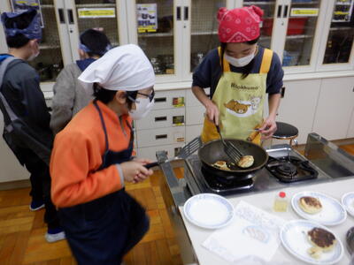 | 6年生は家庭科の学習で、お米と小麦を使った調理実習に取り組みました。 教室に入ると、ふんわりと甘い香りや、ジュージューと食材が焼ける音が広がり、子どもたちのわくわくした気持ちがそのまま伝わってくるようでした。 ホットケーキを作るグループが多く、焼き上がった生地に思い思いの甘い味付けをして、嬉しそうに仕上げている姿がとても微笑ましかったです。 一方で、お米を丁寧に炊いたり、ウィンナーを炒めたりと、工夫をこらしたメニューに挑戦するグループもあり、それぞれが「自分たちで作る楽しさ」を味わっていました。 友だちと声をかけ合いながら作業を進める姿や、完成した料理を見せ合って喜ぶ姿から、学びの中にある温かなつながりが感じられました。 子どもたちにとって、心もお腹も満たされる、素敵なひとときになったようです。 |