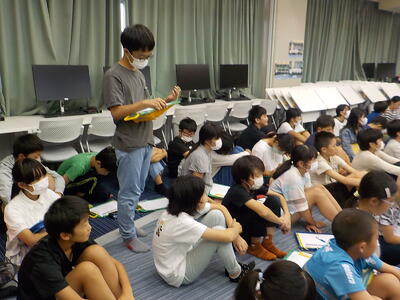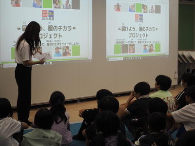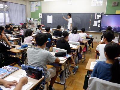 講師として水口大地様をお招きし、御講演いただいた後に校庭で実技の練習を行っていただきました。講演では、子供たちに「夢をもつことの大切さ」や「夢をかなえるために大切なこと」などを御自身の経験を踏まえて、分かりやすくお話しくださいました。