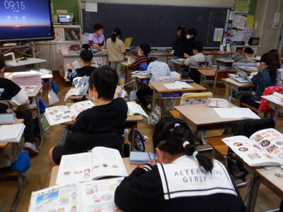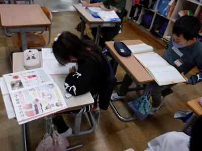 | 3年生の国語では、「食べ物のひみつを教えます」という学習に取り組みました。子どもたちはそれぞれ興味のある食べ物の本を選び、じっくり読みながら“ひみつ”を探しました。 さつまいもがどのように加工されてお菓子や料理に変わるのか、肉がどんな工夫で保存されるのか、牛乳がさまざまな製品に姿を変えるのか…。本を通して知ることのできる食べ物の世界に、子どもたちは目を輝かせていました。 友だちと同じ食べ物ではなく、それぞれ違うテーマを選んだことで、教室には多彩な「食べ物のひみつ」が集まりました。発見を共有し合う時間は、驚きや感心の声でいっぱい。楽しみながら学びを深める姿がとても印象的でした。 |