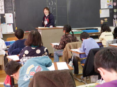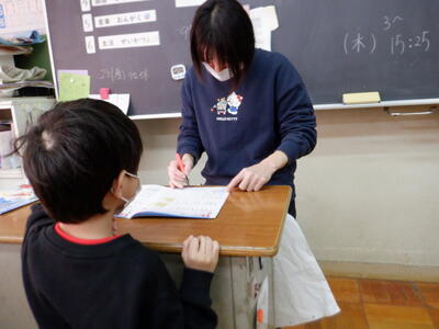 | 1年生の国語では、書き初めの学習に取り組みました。フェルトペンを使って「ふじ山」の文字を書きます。担任の先生の話をよく聞きながら、子どもたちは背筋をぴんと伸ばし、真剣な表情で紙に向かっていました。 平仮名や簡単な漢字を覚えたばかりとは思えないほど、どの子も丁寧に、そして一生懸命に文字を書いていました。書き終えた紙をそっと見せてくれる子の表情には、「できたよ」という誇らしさがあふれていて、その姿がとても微笑ましく感じられました。 新しい年の始まりに、自分の手で文字を書く喜びを味わえた、心がぽかぽかするような時間になりました。 |