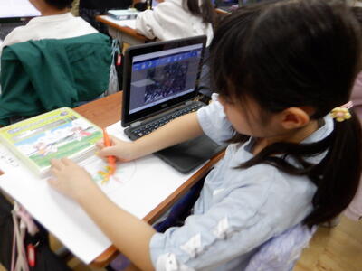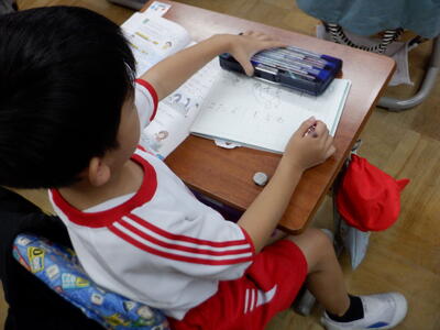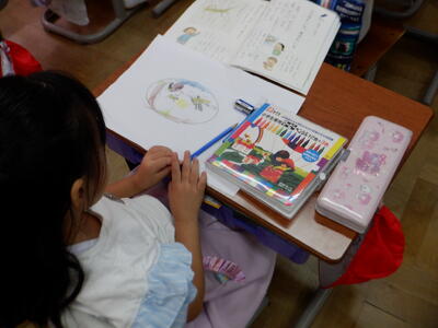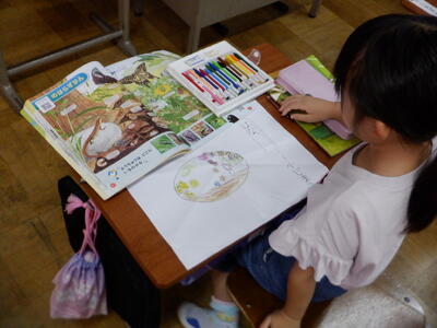 | 今日の1年生の国語では、「しらせたいな、見せたいな」の学習に取り組みました。本日のめあては「見つけたものをくわしく見よう。」です。 子どもたちは、知らせたい「花」や「虫」などを選び、じっくり観察しながらスケッチをしていました。「この色はどうかな?」「足の形はこうなってる!」と、教科書を参考にしながら細かいところまでよく見て描いている姿が印象的でした。 自分の目で見て、感じたことを絵や言葉で表す力が少しずつ育ってきています。後日、みんなに知らせる活動も楽しみですね! |